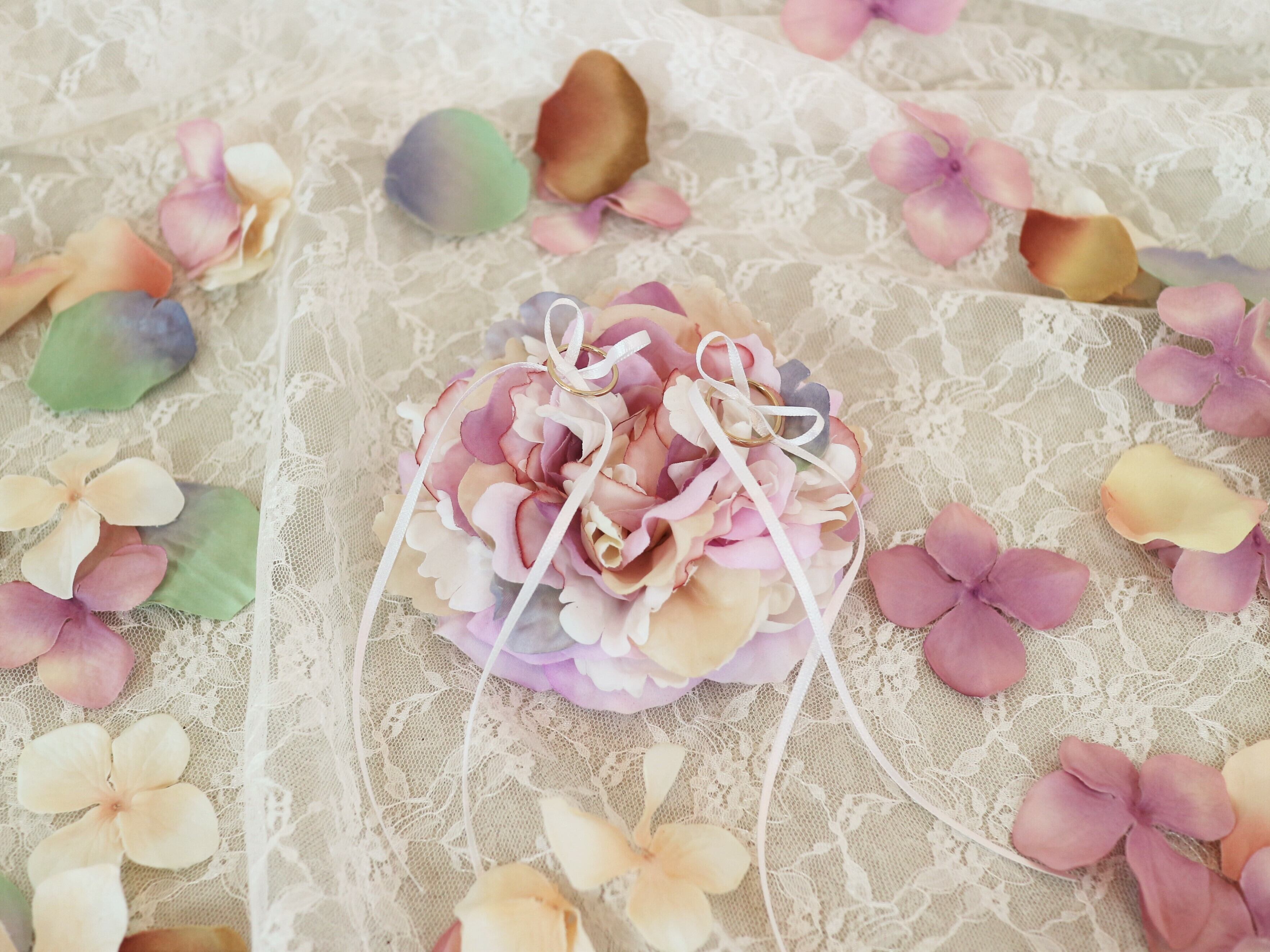 ニュアンスカラーの花びらをギュっと集めたリングピロー。