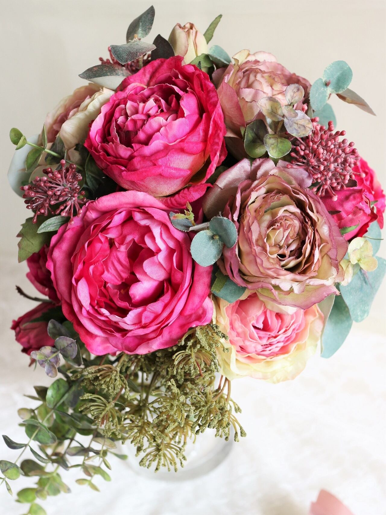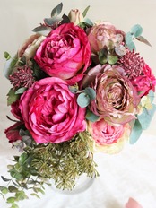 シックなダークピンクのローズをメインに、ブラウンのローズやユーカリを合わせ
