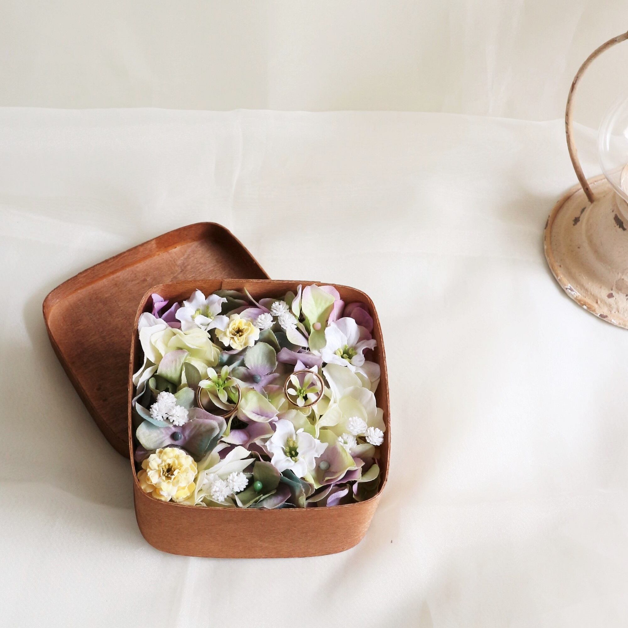 木箱にアーティフィシャルフラワーを敷き詰めたリングピローです