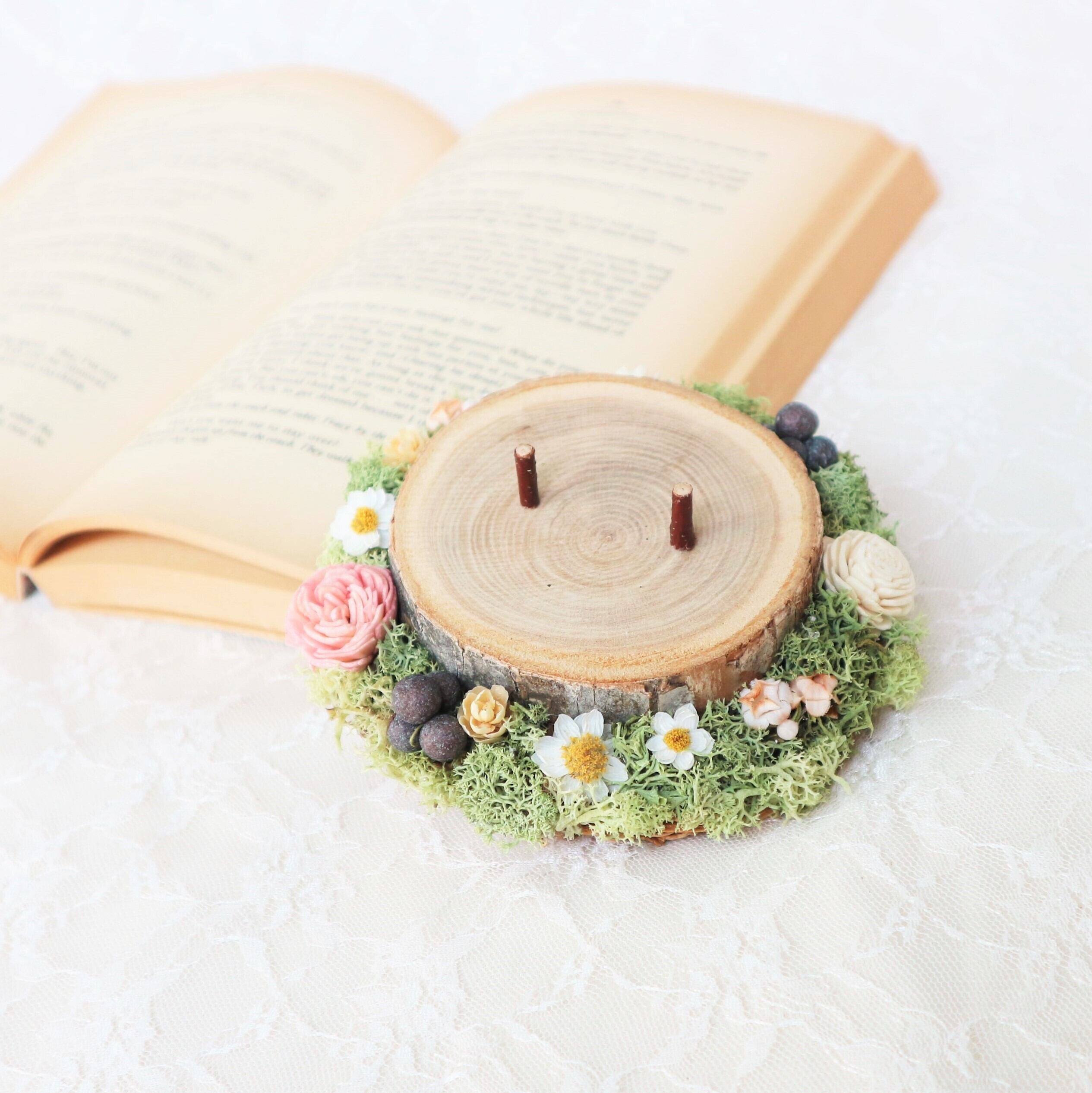 ・天然の素材を使用しておりますので、切り株の形やお花の咲き具合が