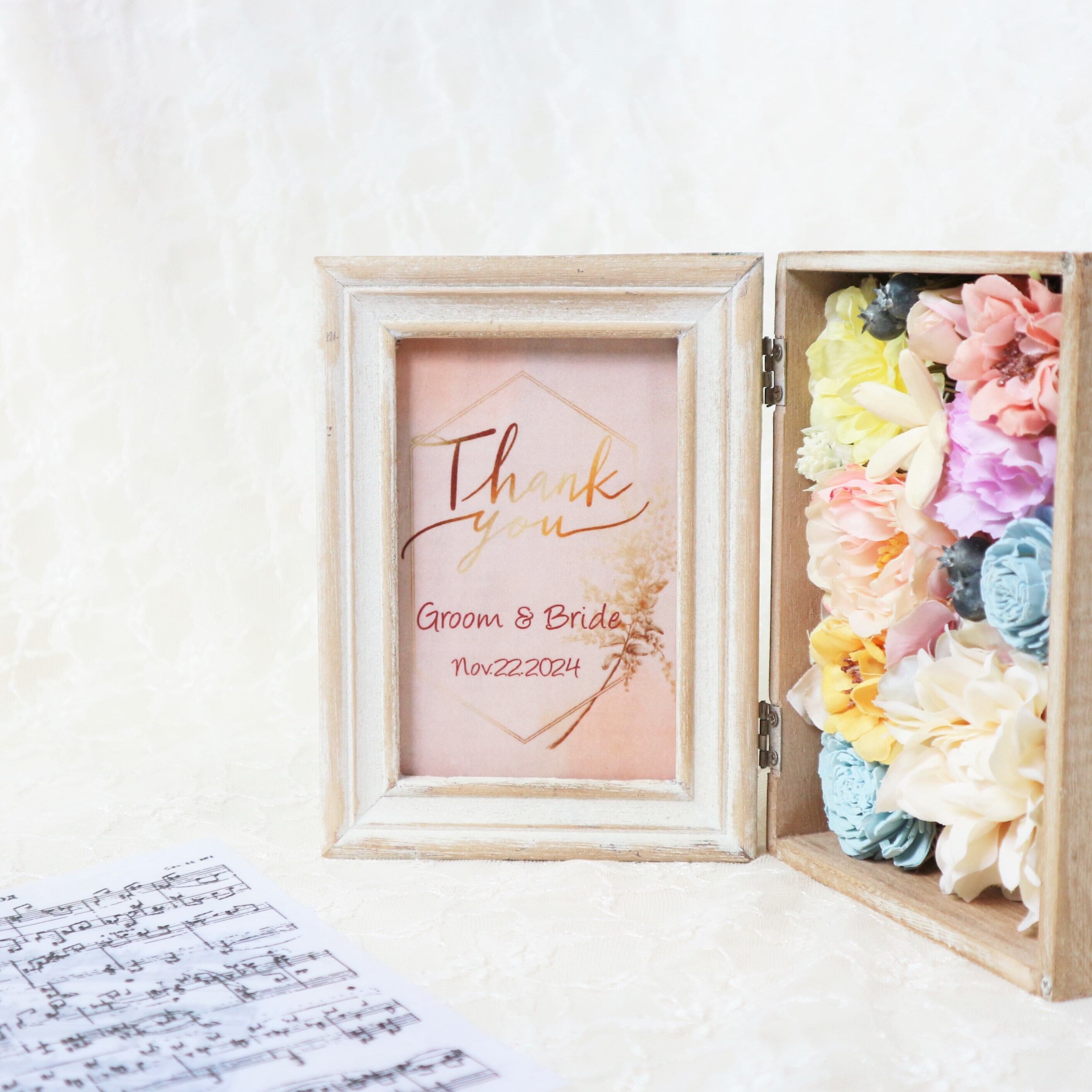感謝のメッセージと共にお二人のお名前・結婚式のお日にちをお入れしてお届けします。